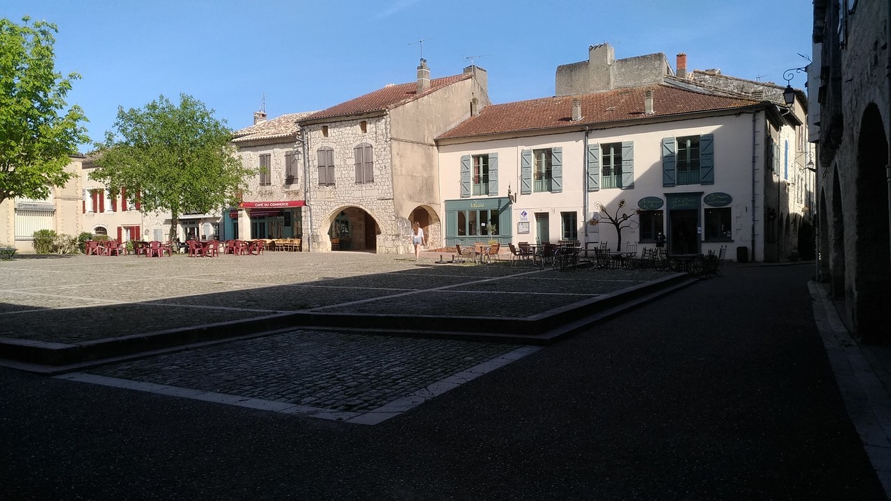 belle cité, remarquable par sa halle aux grains de carte postale, sa place à arcades, sa tour de l'horloge et son église romane et gothique à la fois. Comme on aura monté un peu pour y arriver (ça aura été la seule petite difficulté de la journée), un beau panorama sur la plaine de la Garonne s'offre aux curieux.